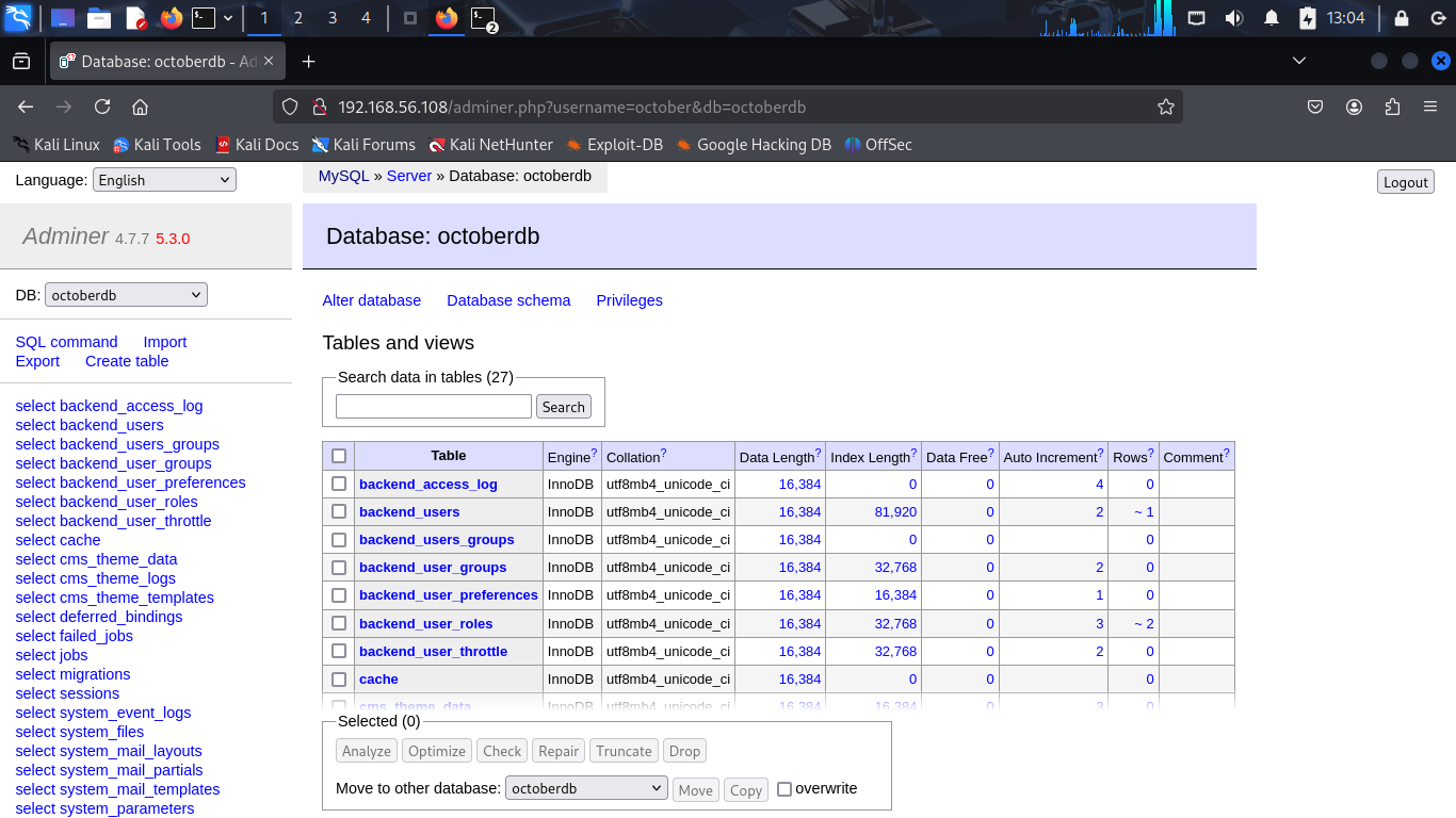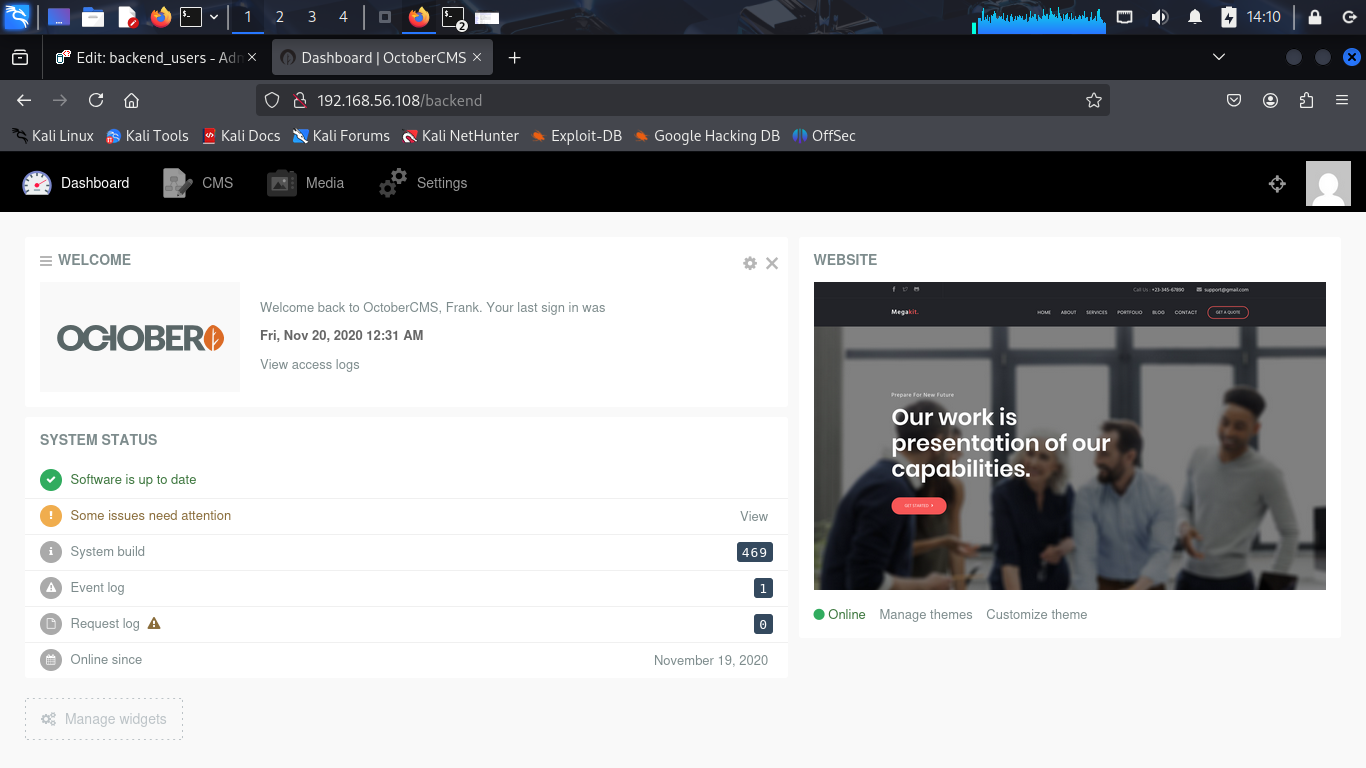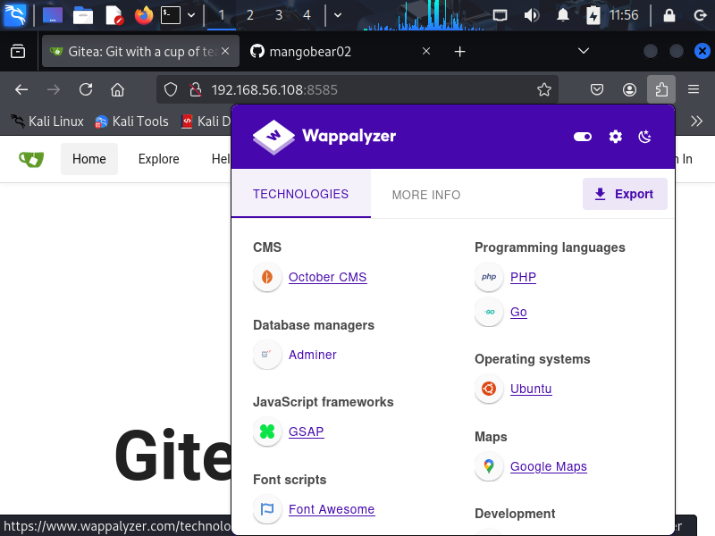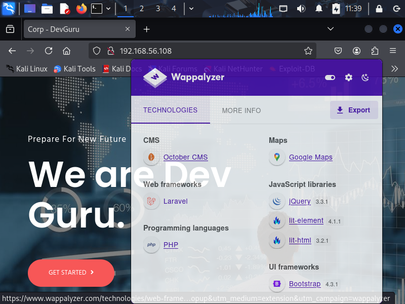 Okey, i will start with the HTTP service on port 80. I open the web browser and go to http://192.168.56.108. And using Wappalyzer to analyze the web application and i find that the web application is written in PHP and using Laravel framework and CMS OctoberCMS.