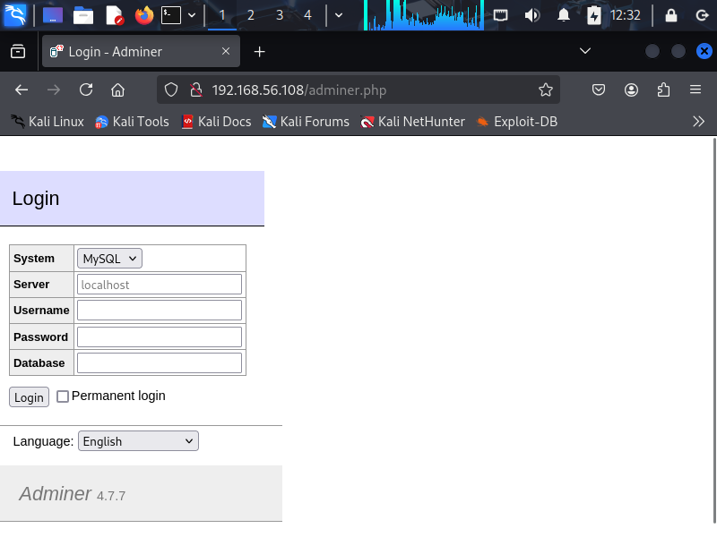 Login to database page.