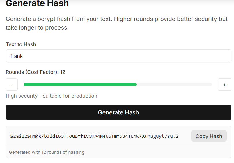 Shiet, i think this way is very complicated. I have another way to edit the password of the frank user. Hash algorithm used to hash the password in Gitea is not just pbkdf2, it also support bcrypt and argon2. I can use the bcrypt algorithm to hash the password and then update the password of the frank user in the database.