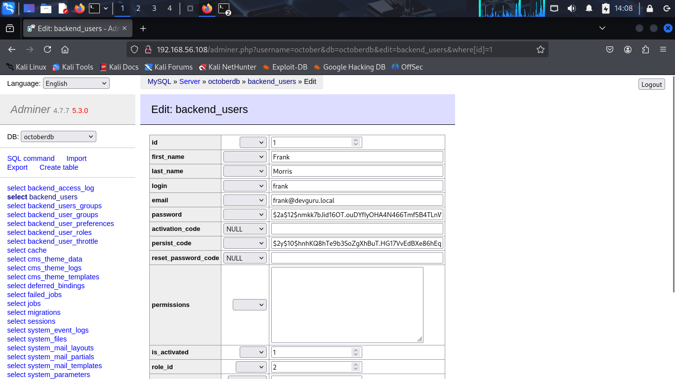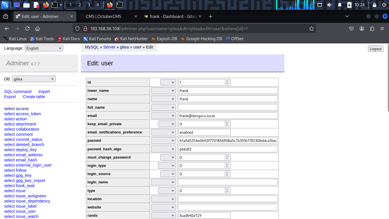 Unlike the OctoberCMS database, passwords in Gitea are hashed using the pbkdf2 algorithm, which is more secure than the bcrypt algorithm used in OctoberCMS. Hmm, to steal the credentials of the frank user, i need to find a way to reset the password of the frank user in Gitea.