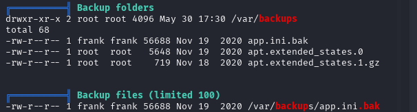 -rw-r--r-- 1 frank frank 56688 Nov 19 2020 /var/backups/app.ini.bak