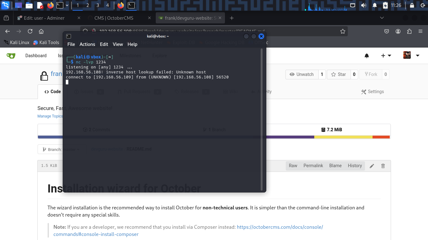 Now i can access to the Gitea web interface as frank user. Hmm, what i need to do now? Remeber the version of Gitea is 1.12.5, maybe it have some vulnerabilities that i can exploit it. Going back to the recon I did above, I mentioned that in Gitea version 1.12.5 is vulnerable to CVE-2020-14144. This vulnerability allows an authenticated user to execute arbitrary code on the server if i’m authenticated. Now i’m authenticated as frank user, i can exploit this vulnerability to get a reverse shell as frank user.